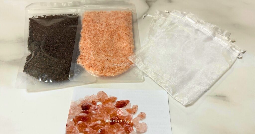 ブラックソルト、ピンクソルト、ポーチ、小冊子が付いてきます。