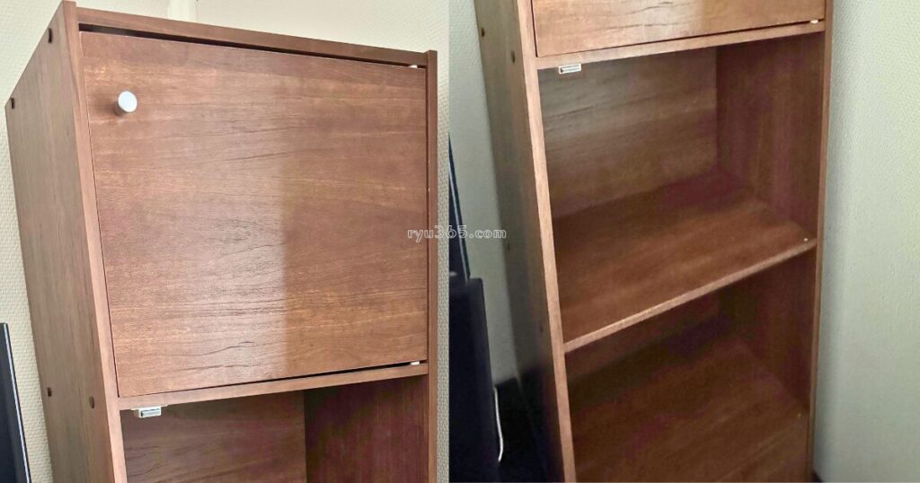 本記事で紹介する収納ボックスは、A4ファイルも縦にすっきり入る収納力と、中身を隠せる扉付きのデザインです。パーティクルボードの1枚板構造で強度にも優れ、組み立てやすさにも配慮された仕上がりです。