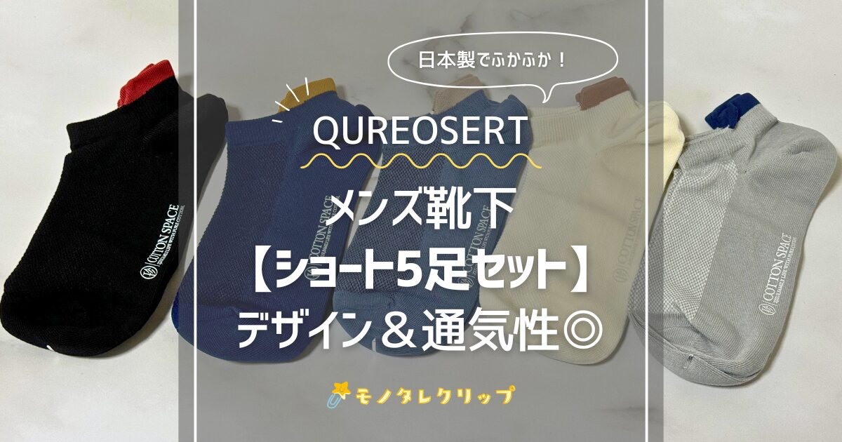 本記事では「Qureosert メンズ靴下 ショート丈5足セット」をレビューします!5種類のカラーバリエーションで、デザインもシンプルで良いと思います。私の場合、暑がりなので秋冬だって関係なく通年OK。くるぶしまでのショート丈なので、ファッションにも合わせやすい。そして何より安いです。この記事では、実際に使ってわかったおすすめポイントや、口コミなどを踏まえてご紹介します。