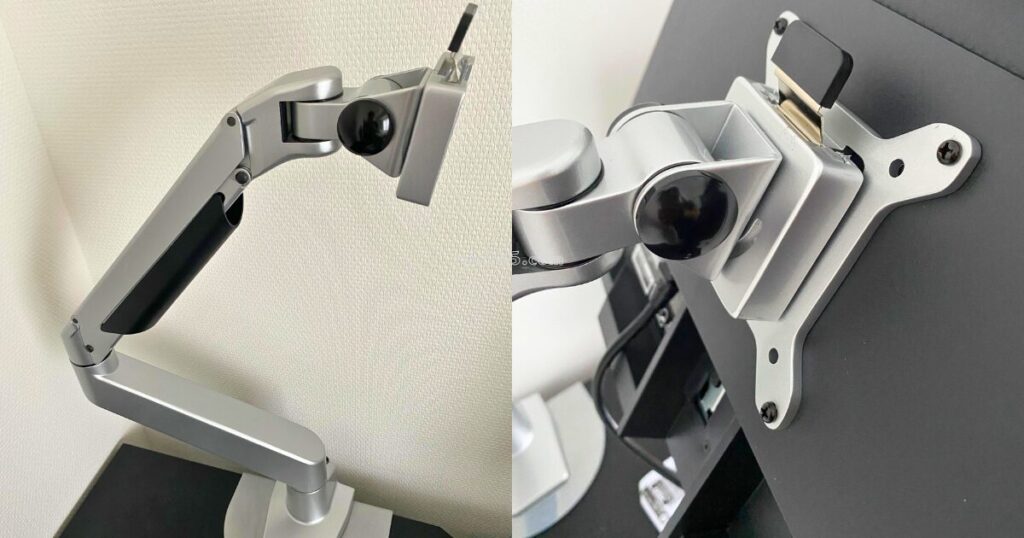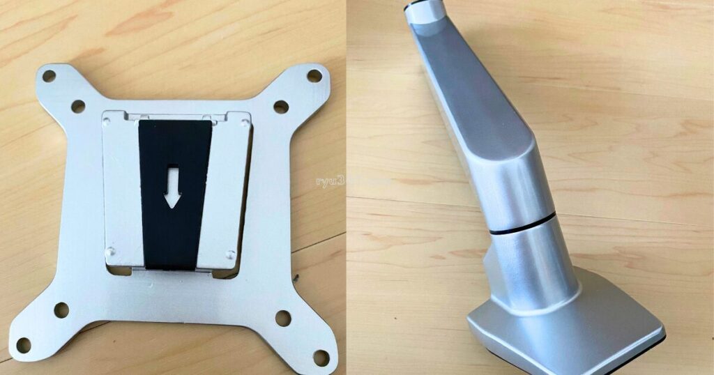 VESAマウントの取付部品とアーム下部・クランプ部分です。デスクに設置する部分は小さくスマート!