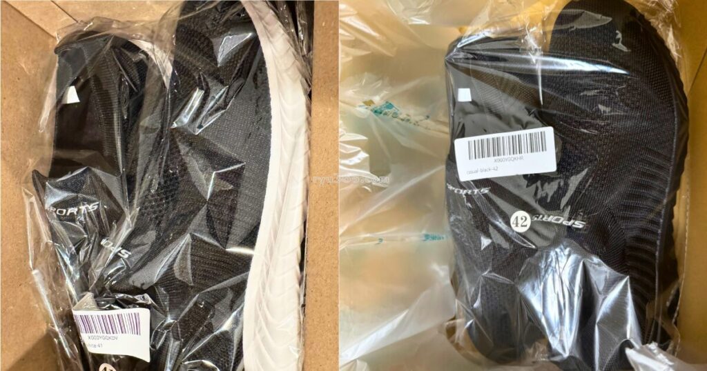 届いたときの様子。靴は柔らかいので配送のキズは心配していませんでしたが、緩衝材付きでしっかり梱包されていました。