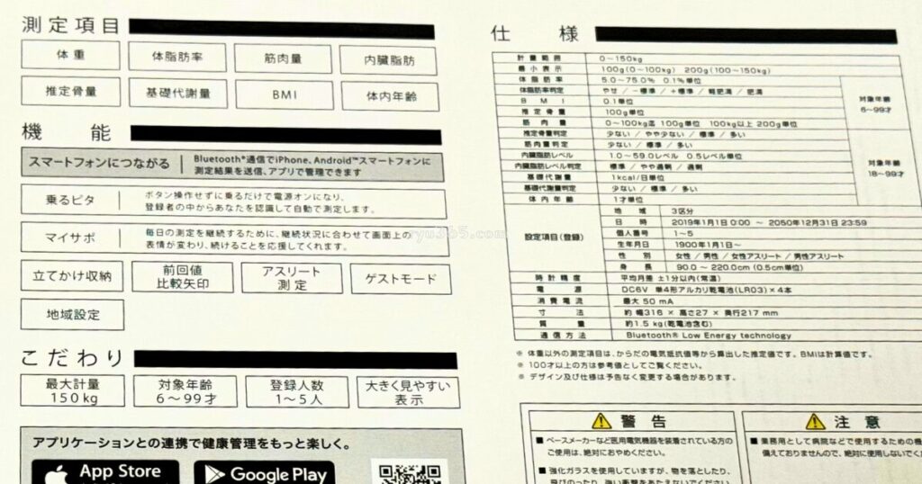 測定可能な項目や機能の説明紙も入っています。