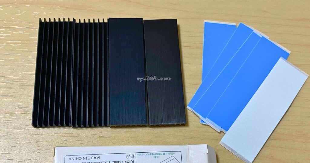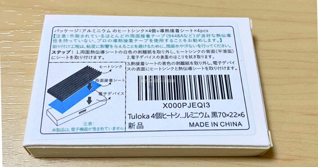 こんな感じで、ヒートシンクと導熱接着シート4pcs付き。裏面に貼るだけなので簡単です。